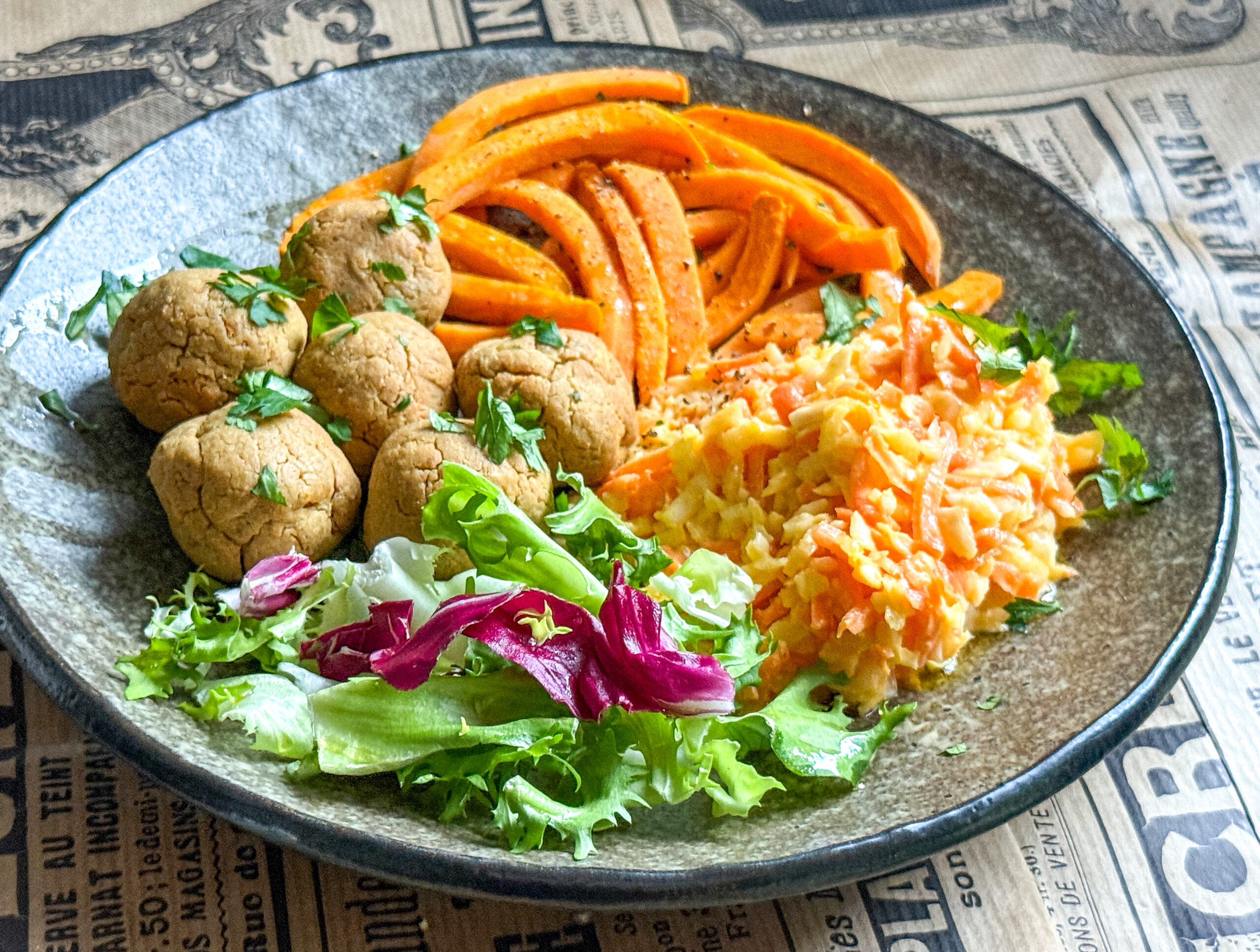 Na talíři jsou cizrnové kuličky, batátové hranolky a coleslaw salát