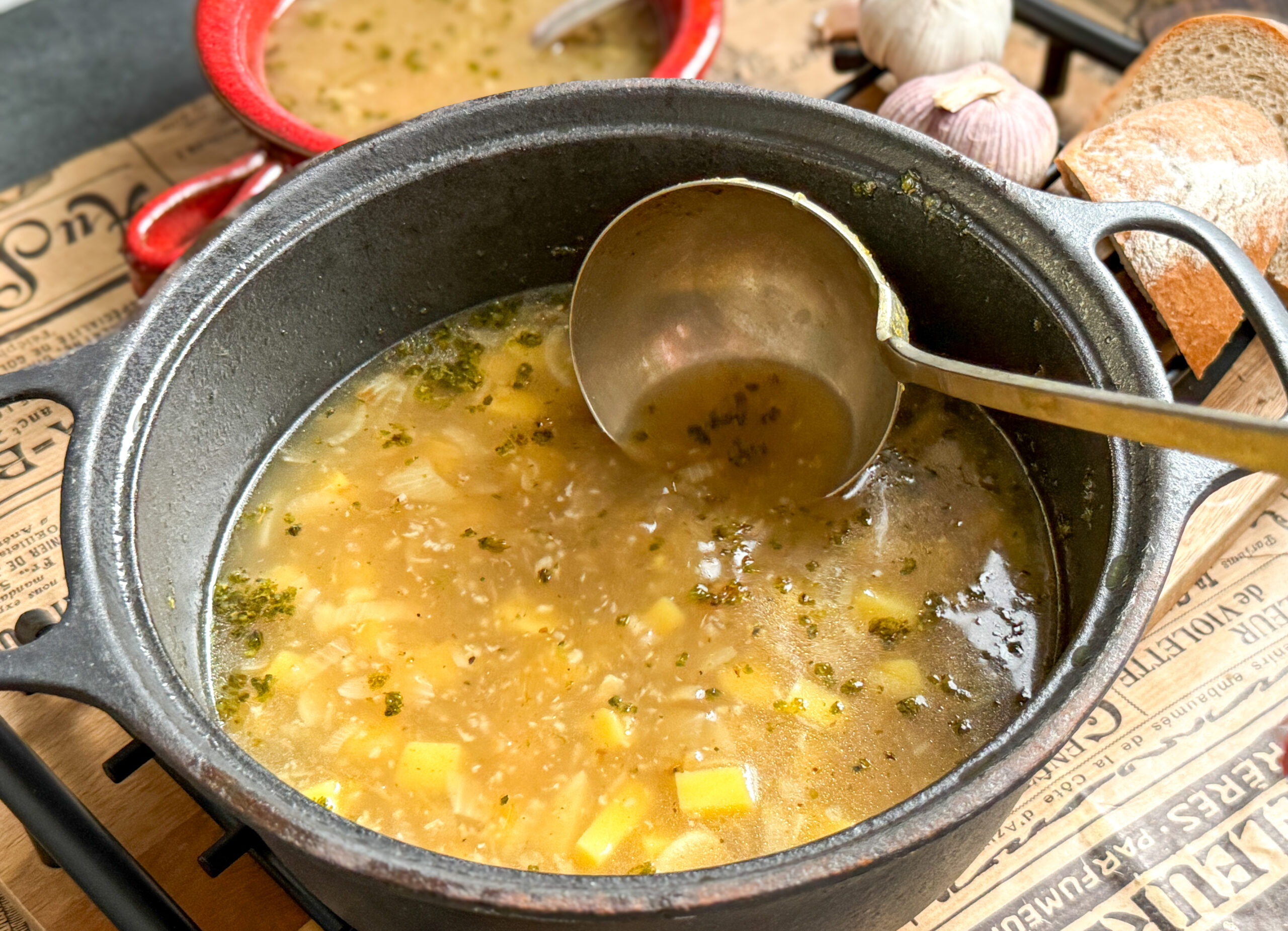 Ke konci do polévky prolisujte ještě 4 stroužky česneku, ať má grády. V této fázi můžete polévku ještě krátce provařit nebo už ji vůbec nevařit, aby síla česneku zůstala. Záleží na tom, jak to vyhovuje vašemu trávení.
