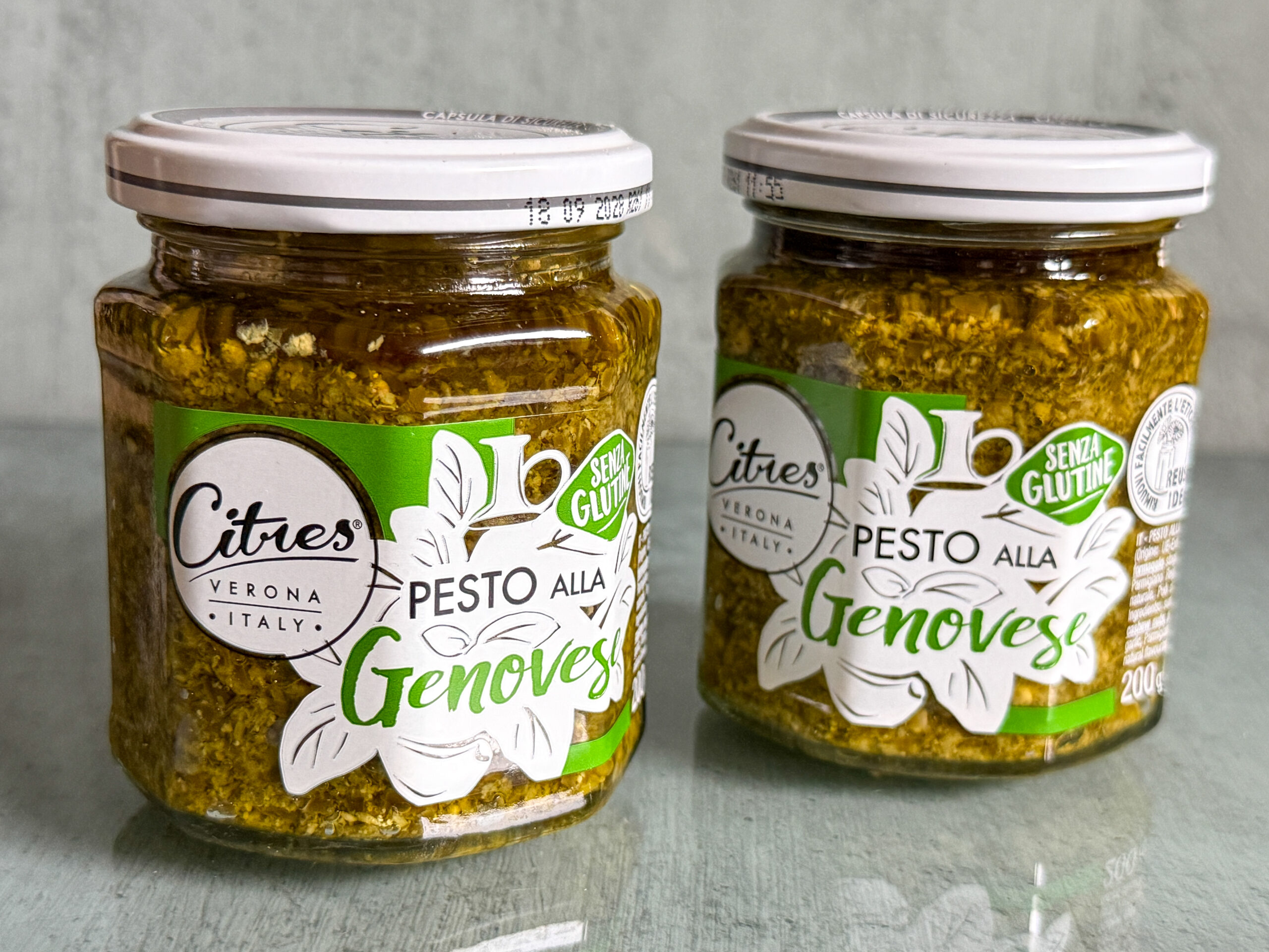 Pesto alla genovese  je autentická italská omáčka z čerstvé bazalky, piniových oříšků, sýra a olivového oleje. Pesto v tomto receptu je pravé italské od značky Citres a obsahuje sýr  Grana Padano a Pecorino Romano. Je skvělé do těstovin i gnocchi, k rybám, do dresinků i do sendvičů. Vyplatí se vybrat to kvalitní, na chuti je to hodně znát. Pesto v tomto receptu je z vinisto.cz , je to konkrétně toto PESTO alla genovese.