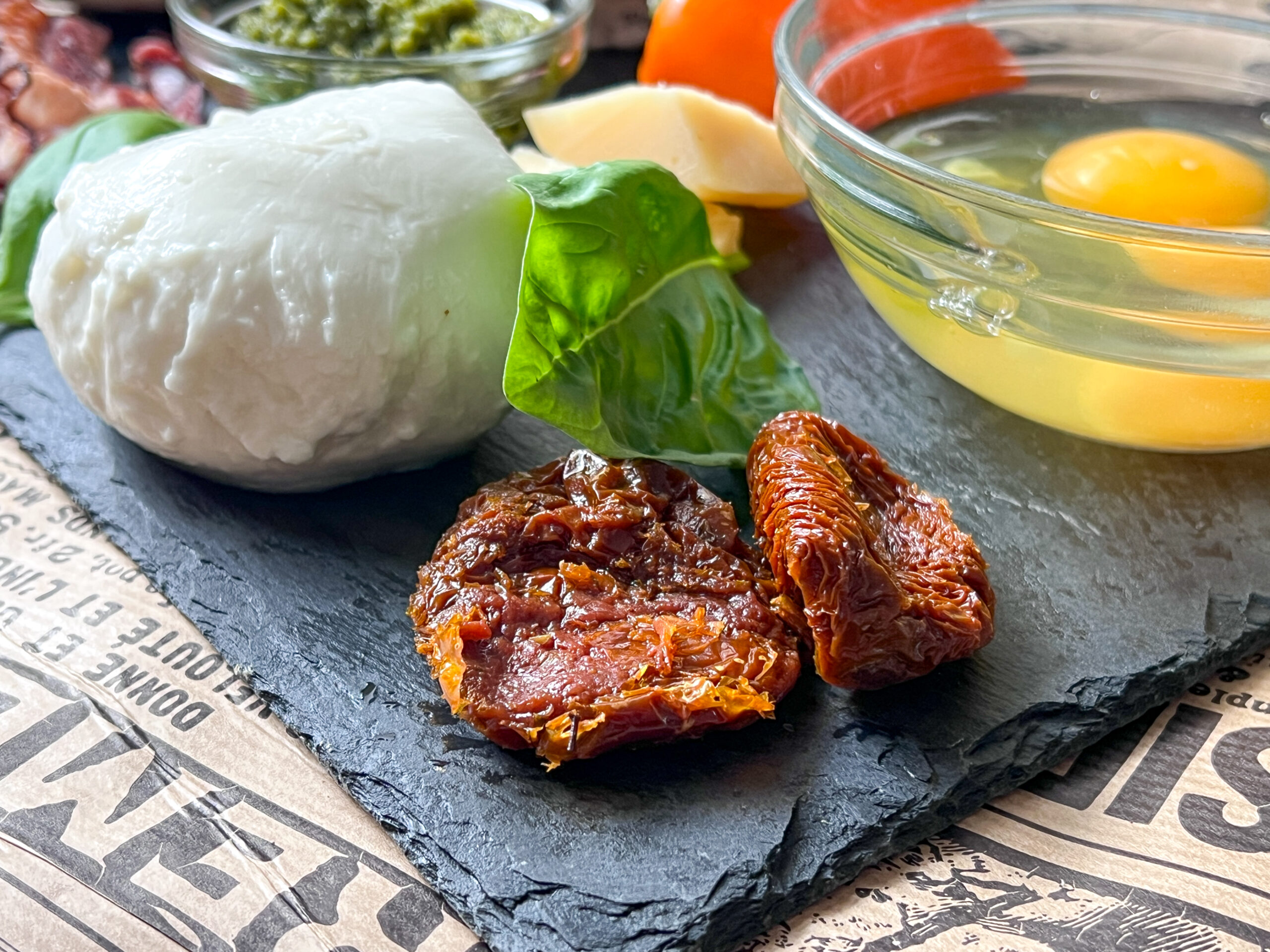 1. Jako první si udělejte vaječnou omeletu a rovnou do ní zapečte nakládaná rajčata zbavená oleje.