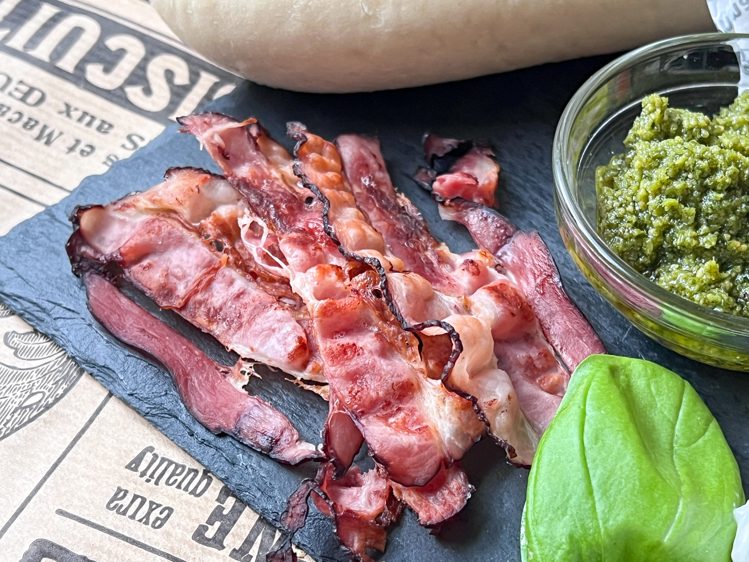 Tato verze Panini je něco pro gurmány. Hodí se nejen na snídani, ale i jako jídlo s sebou nebo na piknik. A pozor! Slanina nemusí být ingredience, díky které je sendvič těžký a mastný. Stačí vybrat kvalitní a libovou slaninu a po opečení tuk odsát papírovou utěrkou.