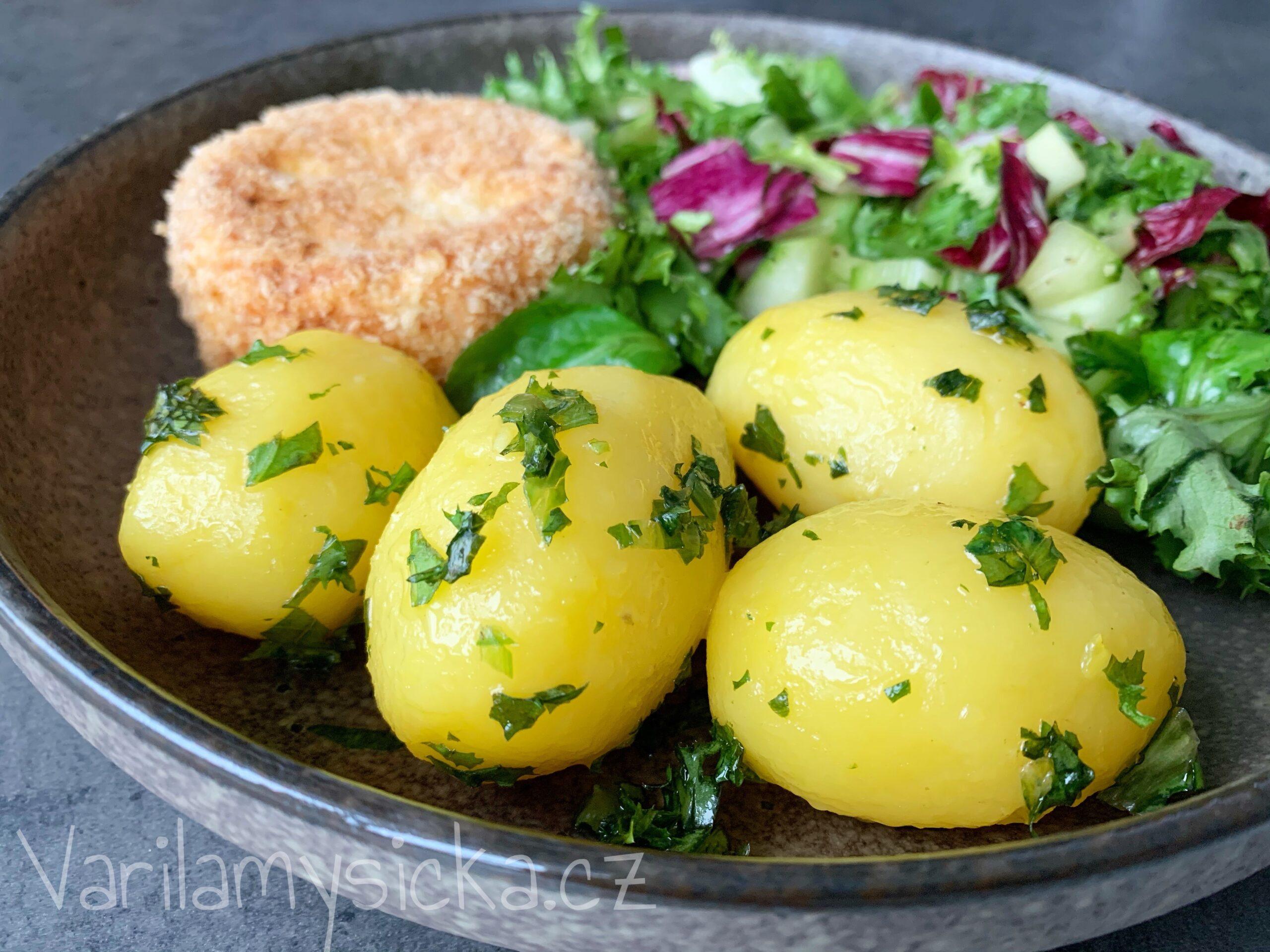 - Jako příloha bylinkové brambory (typ A) vařené ve slupce a salátový mix s domácí zálivkou