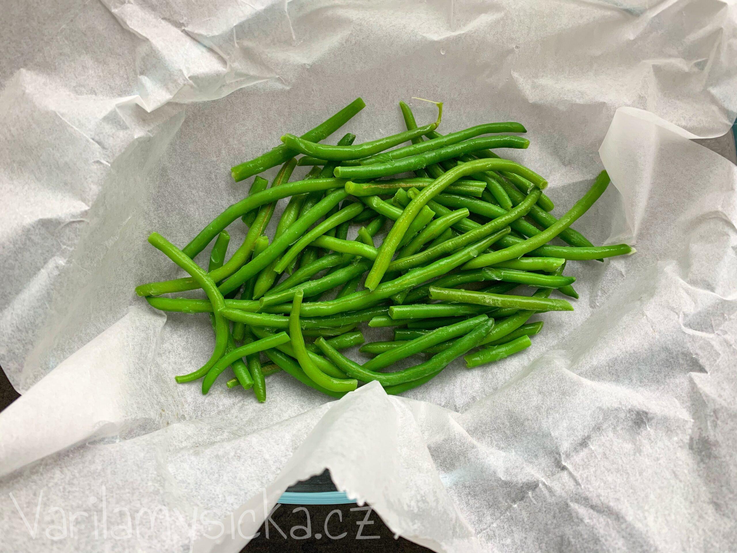 Pod rybu je možné dát různé druhy zeleniny. Teď jsem vsadila na fazolky. Kratší nasekané fazolky bývají rychleji hotové. Tyto dlouhé jsou o něco tužší. Proto je lepší je předem krátce opéct na pánvi. Budou mít i lepší chuť. To samé bych udělala s cuketou, lilkem, brokolicí, pórkem…