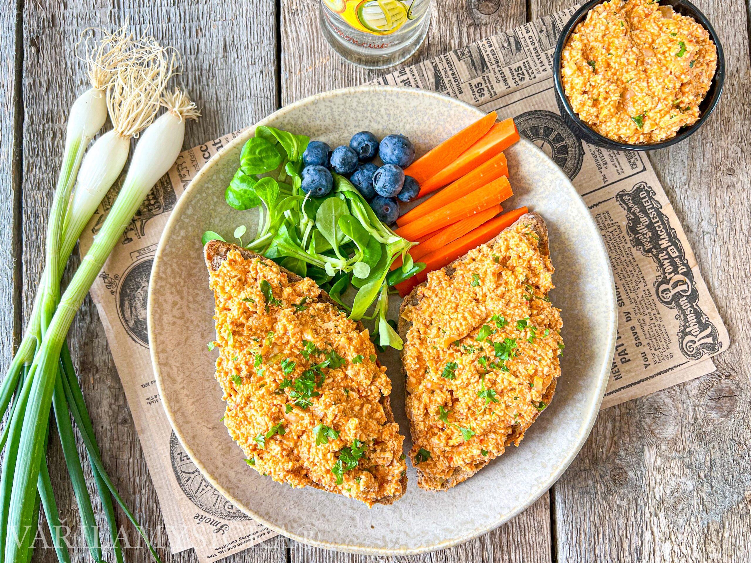 Pokud potřebujete pomazánku vyrobit čistě rostlinnou, místo bílého jogurtu můžete použít např. veganskou majonézu. Do pomazánky se skvěle hodí.