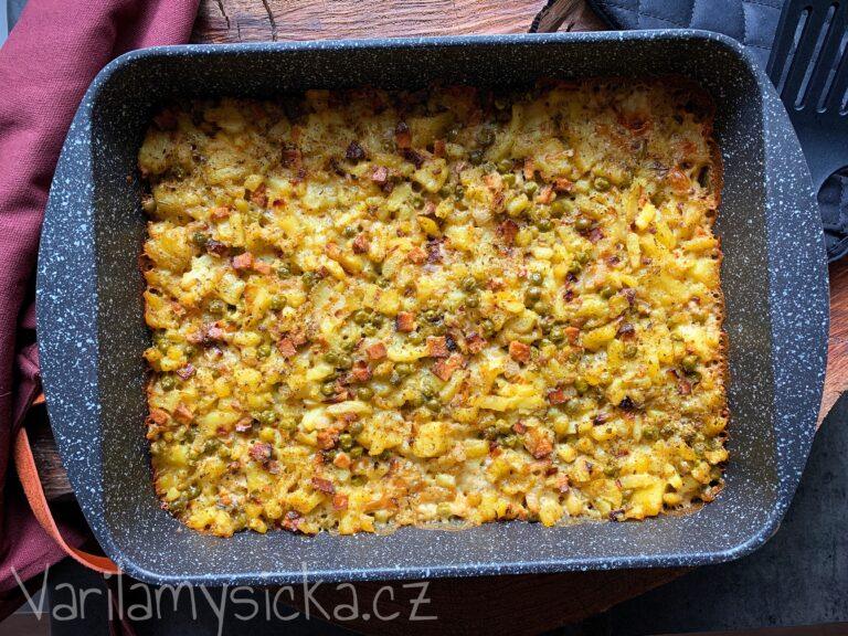 Směs dám do vymaštěného pekáče střední velikosti tak, aby brambory nebyly v příliš vysoké vrstvě. Lepší je vrstva jen pár centimetrů. Zaliju rovnoměrně tučnější smetanou a zapeču v troubě do zlatova bez poklopu. Peču asi na 180 stupňů 30 až 35 minut. Hotovo!