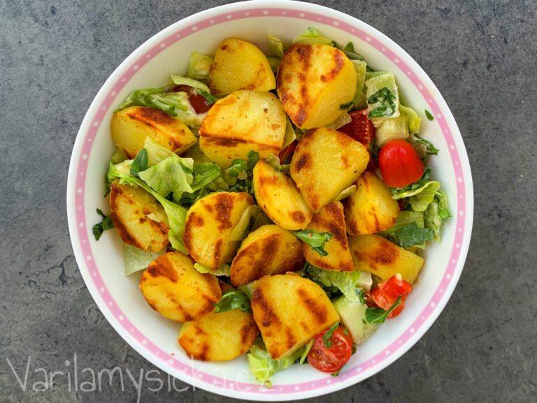 - V misce smíchám ingredience na dresing.Dresing smíchám se zeleninou, přendám do větší misky a navrch dám porci orestovaných brambor.